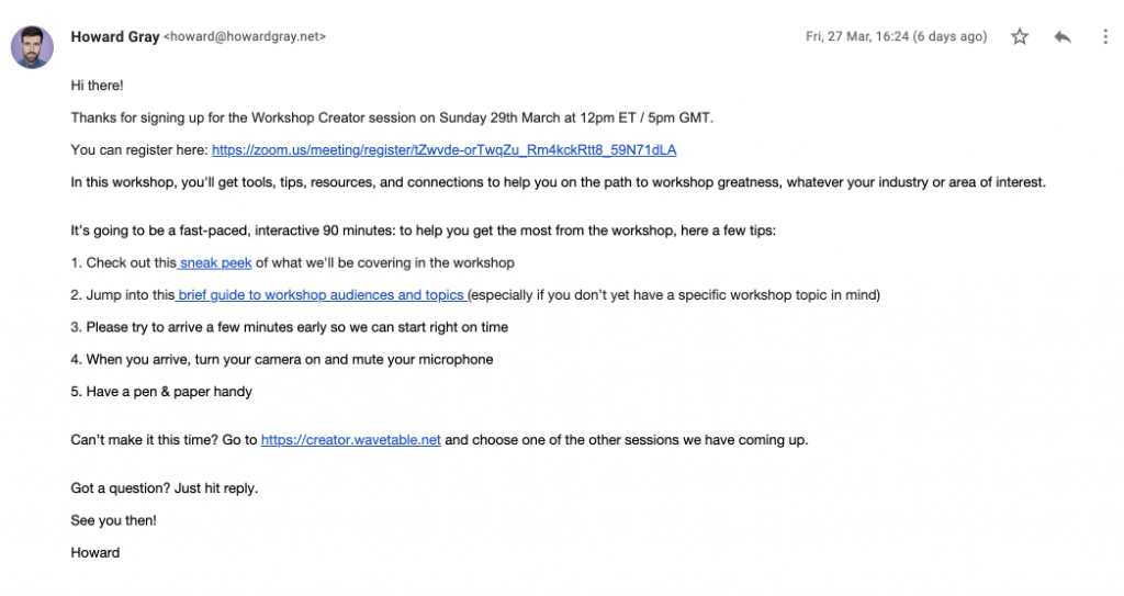 At the end of part 1 we got the Zoom registration link set up. Hopefully by now you’ve had a bunch of notification emails hitting your inbox – lots of lovely people signing up for your workshop.