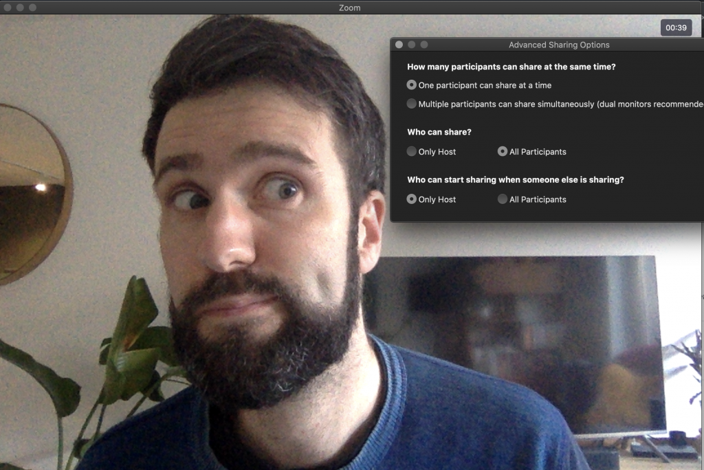 - Underneath, you’ll see ‘Advanced Sharing Options’. Click that and you’ll see a modal appear. I strongly suggest setting ‘Who can share?’ to ‘Only Host’. Obviously if your workshop involves participants sharing stuff you’ll need to set this to ‘All Participants’ but generally, I recommended using ‘Only Host’ as a safety catch. This prevents Zoom Bombing which I mentioned in part 1 – we don’t want someone randomly coming into our session and taking over the screen share with something NSFW (Not Safe For Workshops)